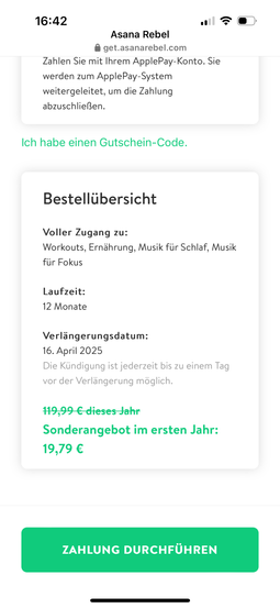 Bsp. Asana Rebel Das Onboarding ist mit über 20 Seiten (irgendwann hab ich aufgehört zu zählen) sehr lang. Man gelangt aus dem Link im Instagram Profile zum Web-Onboarding an dessen Ende der Nutzer einen Account registriert und dann die Premium Subscription kaufen kann. Das gleiche Onboarding findet auch in der App statt.